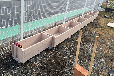 プランターをきっちり並べたら、あとはフェンス部分を差し込むだけです。製品の加工精度が高いこともあって、全くガタつきがなく、とっても簡単で誰にでもできます。