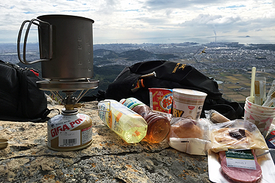 こちらは、Hくんが買ってきたイワタニ・プリムスのバーナーとクッカー。こちらも、この時が初点火です。購入後、一度も点火せずに、新品のままで山頂まで持ってきたとか(^^;