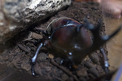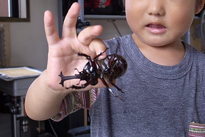 はじめて見る本物のカブトムシを、おっかなびっくり持ち上げる息子。